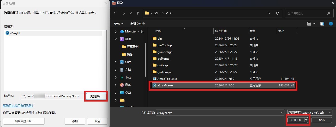 6.将需要通过防火墙的软件添加进去(红框内为软件安装位置,以V2rayn.exe为示范)