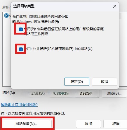 7.选择"网络类型"并将专用和公用网络全部勾选