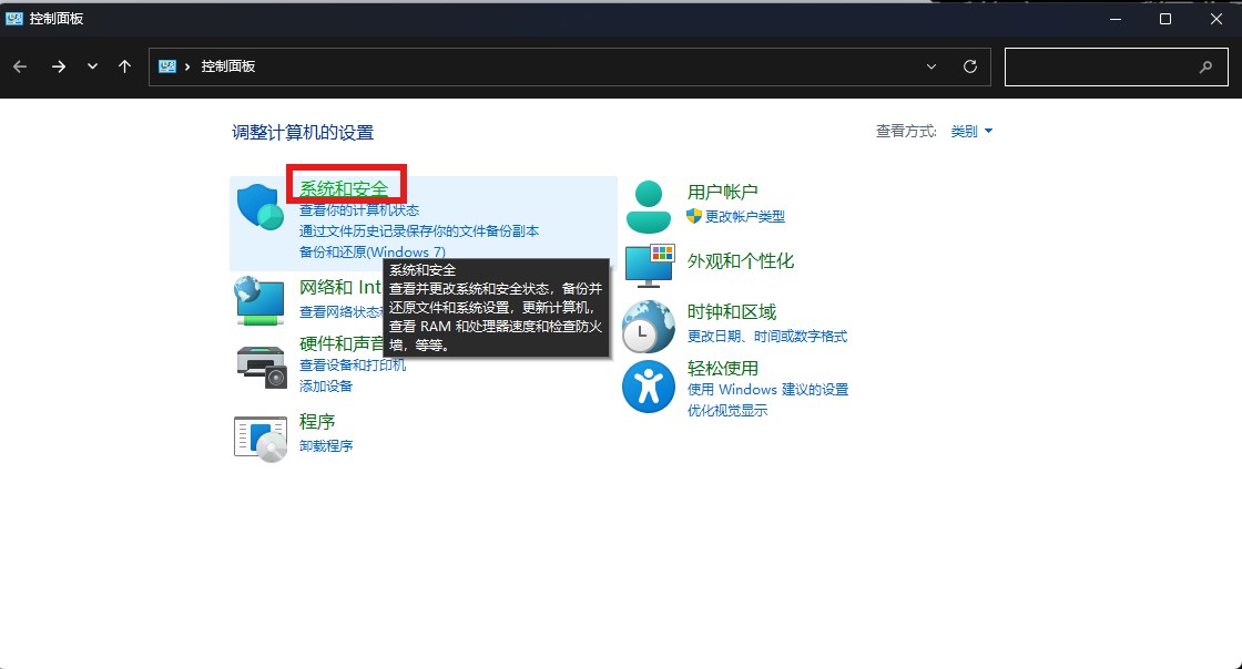 2.选择"系统与安全"