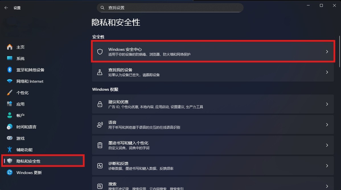 2.进入设置内的隐私与安全性,选择顶部的Windows安全中心,并选择顶部的打开Windows安全中心