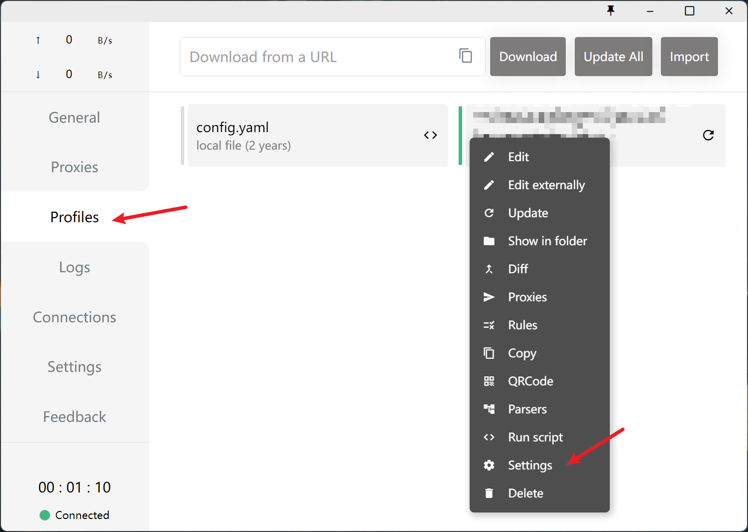 1.点击左侧 Profiles,找到之前添加的订阅,在上面右键,点击 Settings